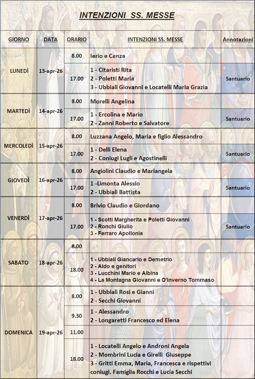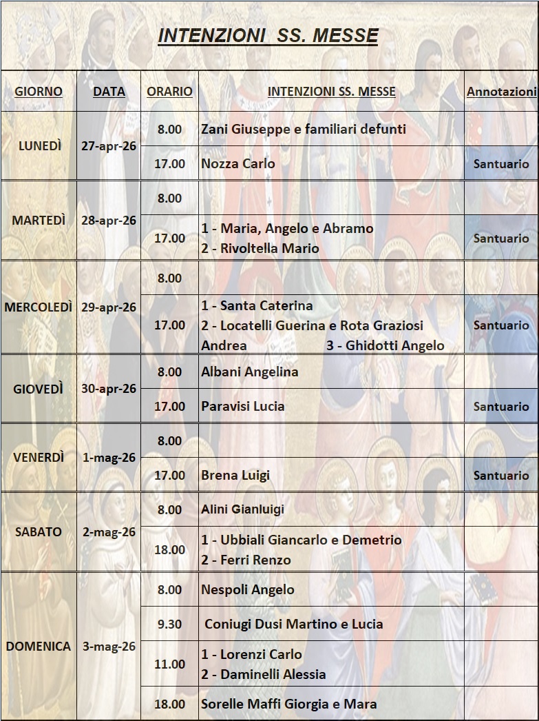 Pubblicato inArticolo Intenzioni SS.Messe Per i nostri cari defunti, perché il Signore li accolga nella sua luce e nella…